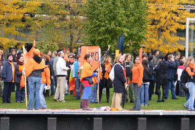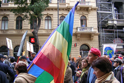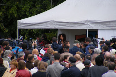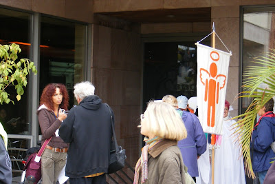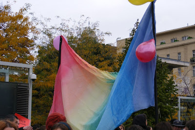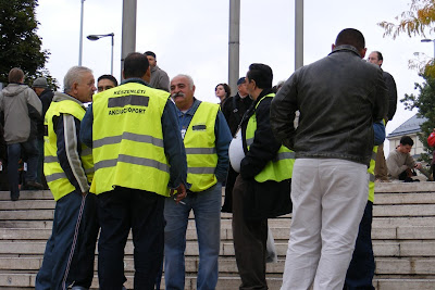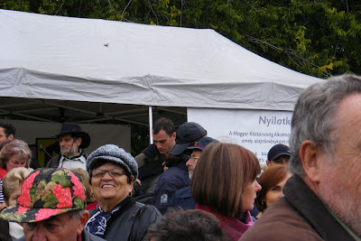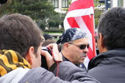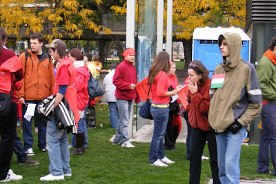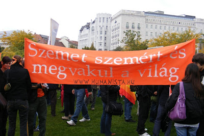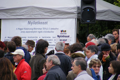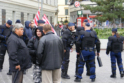 Az "árpádsávos" különítményt (figyeljétek a Pokol Angyalai-dizájnt!) Deák Gábor (MaZsiKE, Magyarok a Nácik Ellen) arra hivatkozva nem engedi be, hogy lobogójuk politikai jelkép. Ez ellen a jelenlévők (köztük a kurucinfó egyik szerkesztőjének tartott személy) tiltakoznak.
